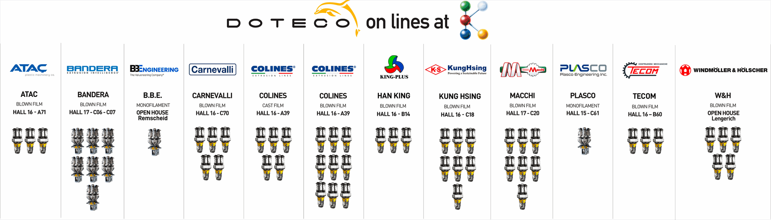 Vuoi vedere qualche dosatore gravimetrico in azione? Nessun problema! Ci saranno oltre 50 macchine Doteco operative sulle linee di estrusione dei nostri partner, sia direttamente in fiera che durante eventi open house.